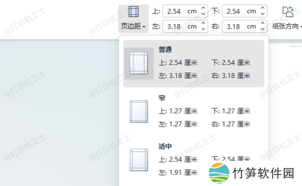 2、可选择“普通”、“窄”或“自定义边距”,确保页码不会超出打印范围。
