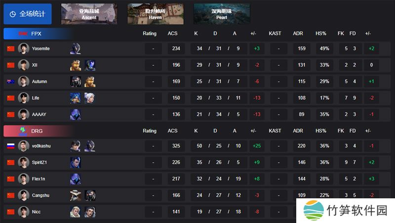 图一亚海悬城,DRG 13:11 FPX,图二隐世修所,DRG 13:5 FPX。vo0kashu选手拿到了全场最高的50总击杀。