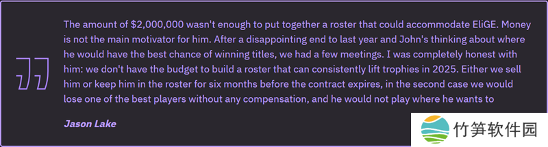 “200万美元的资金并不足以打造一支能让EliGE满意的阵容。金钱并非他的主要动力。在去年经历了令人失望的结局,且EliGE思考着自己在哪里能有最大的夺冠机会之后,我们进行了几次会面。我对他坦诚相告:我们没有足够的预算来组建一支能在2025年持续夺冠的阵容。要么我们卖掉他,要么在他的合同到期前的六个月里将他留在阵容中,而如果是后一种情况,我们将在没有任何补偿的情况下失去一位最优秀的选手,而且他也无法在他想效力的地方参赛了。”