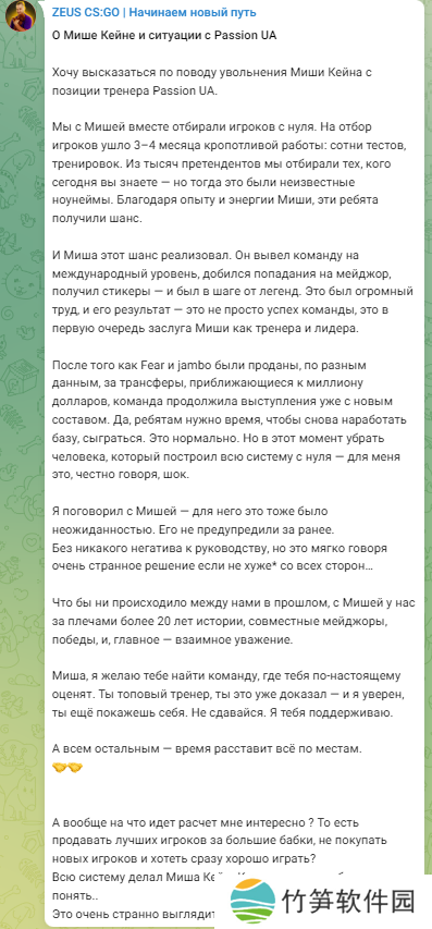 Passion UA战队官宣主教练Kane离队后,前CS职业选手,Kane的老队友Zeus在个人社交媒体账号上就此事发表了评价。