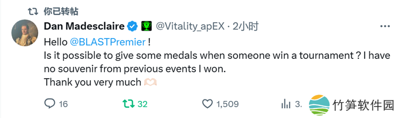 Vitality战队选手apEX在社交平台上喊话赛事主办方BLAST,询问能否给冠军选手们发放奖牌。