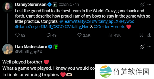 apEX在下方回复道:“打得好,兄弟,这是一场如此精彩的比赛。我知道你会在属于自己的地方卷土重来,在总决赛或是赢得奖杯的地方。”