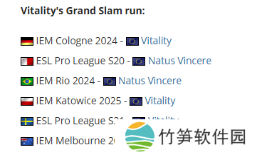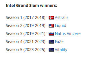 根据ESL制定的大满贯规则,一支队伍需在连续十场由ESL举办的大满贯赛事中赢得四次冠军,且其中必须包含至少一次EPT冠军赛事(即IEM 卡托维兹站、IEM科 隆站或ESL主办的Major赛事)。达成条件后,队伍将获得100万美元奖金,并成为当季大满贯得主!