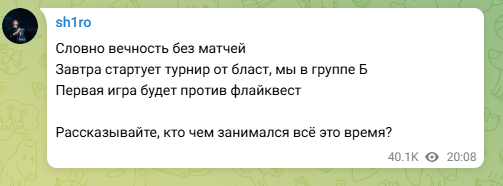 Spirit战队狙击手sh1ro在个人社交媒体账号上发布动态,表示自己好像已经很久没有打比赛了一样。