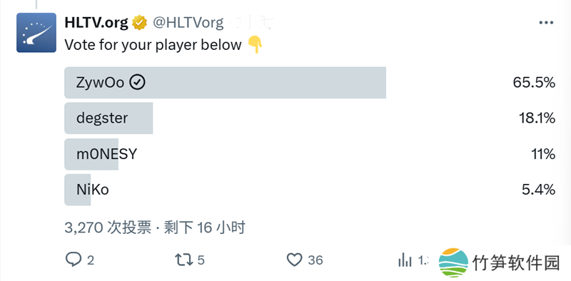 截止发文,ZywOo以65.5%的得票率位列第一,degster则位居第二。
