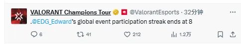 VCT官推:EDG连续参加国际赛事的记录定格在了八次。