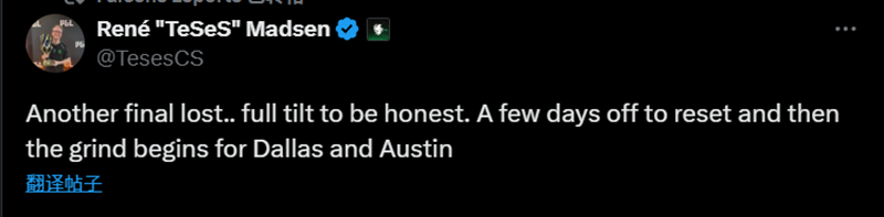 TeSeS:又一场决赛失利……说实话,心态已经完全崩了。接下来几天休息调整,然后为IEM达拉斯和奥斯汀Major的比赛重新投入战斗。