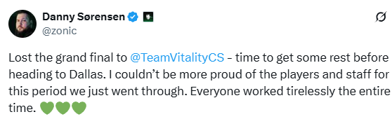 zonic:总决赛中不敌Vitality,在前往达拉斯前需要稍作休整。我为我们刚刚共同经历的这段时期感到无比自豪,无论是选手还是工作人员都在这段时间里不懈努力。