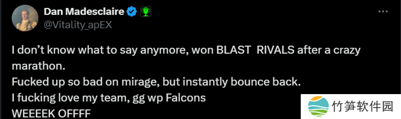 apEX:我已经不知道该说什么了,在一场疯狂的马拉松式比赛后赢得了BLAST巅峰赛S1冠军。Mirage上打得太烂了,但立刻调整了回来。我太爱我的队伍了,ggwp!Falcons,这一周太疯狂了!