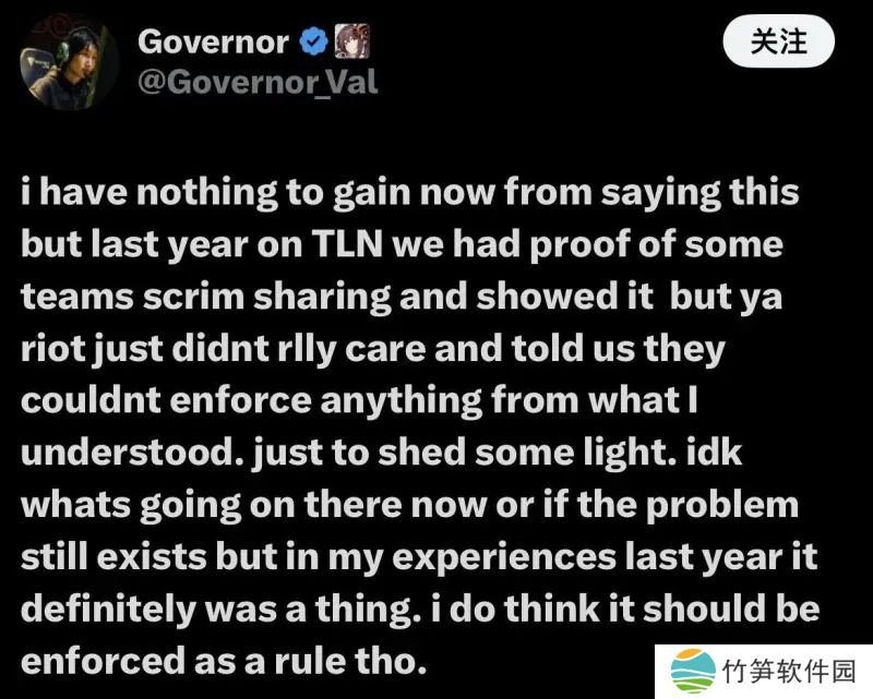 "我现在这么说并没有什么好处,但是去年在TLN,我们有一些队伍共享了训练赛的证据,也摆出来了。但是呢,拳头并没有重视,还告诉我们他们无法执行任何事情。我只是提供一下信息。我不知道现在事情咋样,还是说现在这样的问题依旧是存在的。但根据我去年的经验,确实发生过训练赛共享这事。我真的认为应该将其作为一项规则制度来执行。