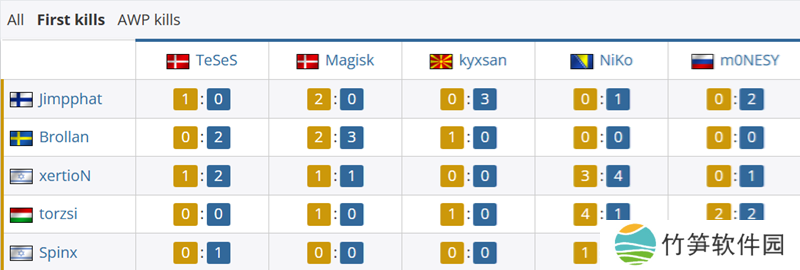 首杀对位上,NiKo为队伍贡献9个首杀。而MOUZ一方最多的是torzsi,为8个首杀。