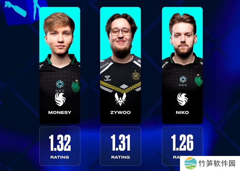 在已经完成的比赛中,m0NESY以1.32的Rating领先ZywOo,后者以1.31的Rating排名第二,NiKo也以1.26的Rating紧随其后。值得一提的是,m0NESY在淘汰赛阶段的Rating高达1.50,ZywOo也有1.44,而NiKo只有1.04。