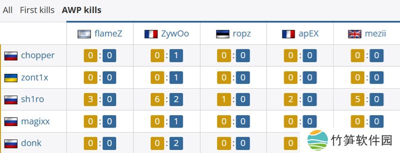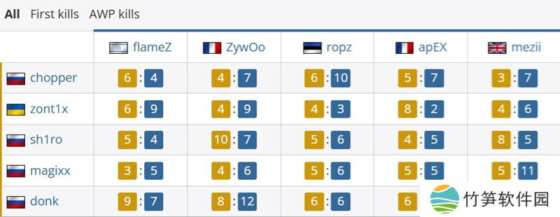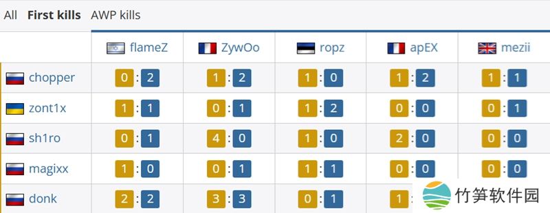 首杀对位上,ZywOo为队伍贡献7次首杀,flameZ贡献6次。而Spirit一方最多的是sh1ro和donk,均为7个。