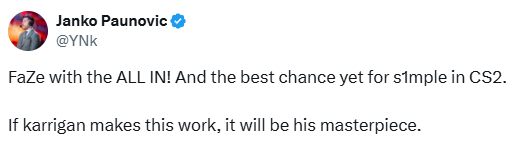 YNK:FaZe战队这一波可谓孤注一掷!而这也将成为s1mple在CS2时代最具夺冠潜力的一次机会。