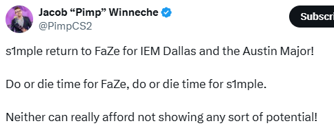 Pimp:s1mple重磅回归FaZe,剑指IEM 达拉斯与奥斯汀Major!