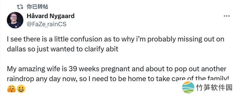 rain在社交平台上分享了自己缺席IEM 达拉斯站的原因。