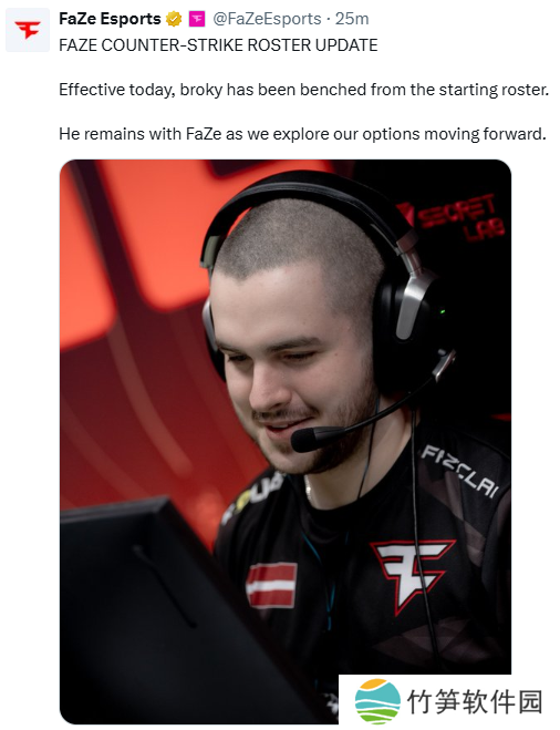 就在刚刚,FaZe于官推宣布将队内狙击手broky下放至替补席。