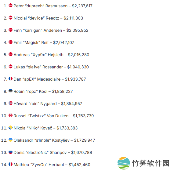 Astralis的选手device、Magisk、Xyp9x和gla1ve也凭借其Major征程,奖金排名稳居高位。