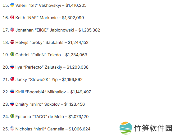 TOP25CS职业选手累计赛事奖金完整榜单如下(数据来自液体百科——最新更新于2025年5月6日):
