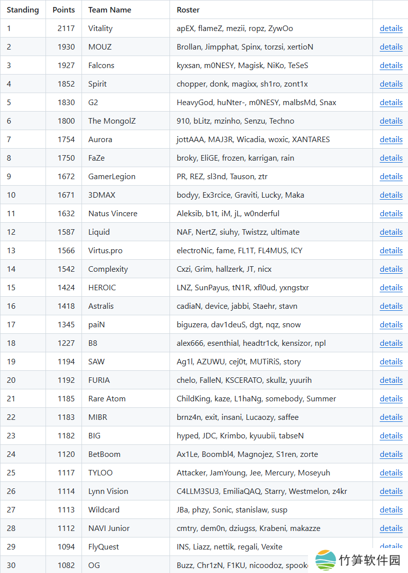 欧洲区方面和世界排名保持高度一致,世界第一战队Vitality的积分超过第二名