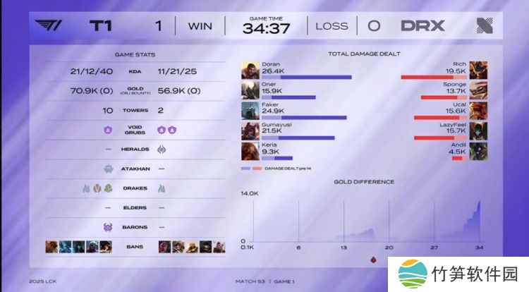 首局比赛T1前期稳健运营,但Doran杰斯在上路幽默白给了一把。中期T1首先拿下4K经济优势,但是Faker维克托河道落单被击杀,ucal安妮闪现R两个配合队友追击打出0换4之后打回一波!随后河道团Keria酒桶E闪R失误白给,又让DRX拿下一条小龙!27分钟中路Gumayusi霞落单被安妮E闪R秒了!DRX回头开大龙但是太痛了!T1的poke+追击打出3换4!随后一波野区团战DRX阵型稀碎,Rich兰博连续白给,T1拿下大龙之后不给机会,一波冲泉强杀Lazyfeel烬之后结束首局比赛!