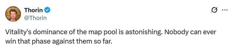Thorin表示:“Vitality战队在图池上的统治力令人震撼,至今仍无人能在这一环节击败他们。”