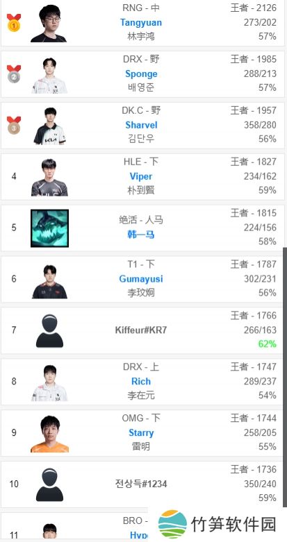 直播吧5月9日讯 韩服前十榜更新,LPL选手RNG中单Tangyuan以2126分位居第一,OMG下路Starry以1744分位列第九,LCK选手DRX打野Sponge第二、DK二队打野Sharvel第三,HLE下路Vipere第四、T1下路Gumayusi第六,DRX上单Rich第八。