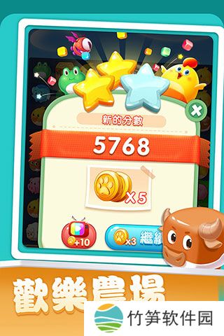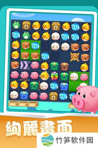 游戏画面采用农场风格,清新简洁。玩家通过移动场景中的动物来完成三消任务,目的是完成每个关卡的指定目标。每个关卡都有步数限制,超出步数无法获得三星评价。