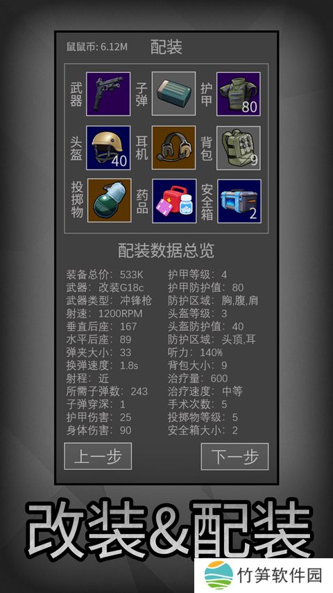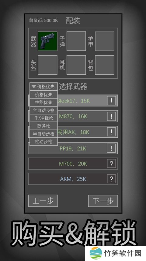 游戏开始后,玩家需要选择一个主武器。武器是通过购买“感叹号”解锁的,而不是直接免费选择。按照系统提示完成选择并点击下一步。