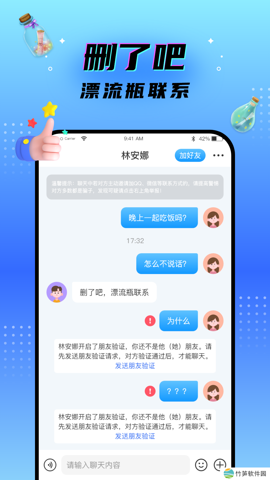 脱单漂流瓶app功能1、一款集聊天交友、同城恋爱、情感树洞、附近陌生人社交于一身的脱单神器。