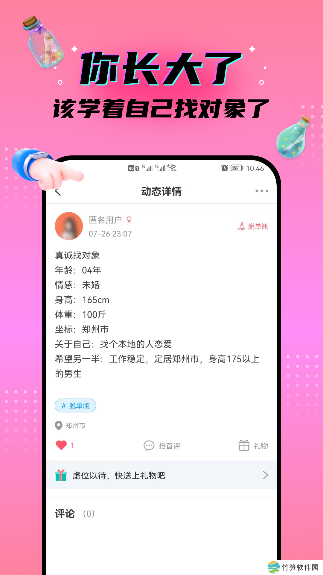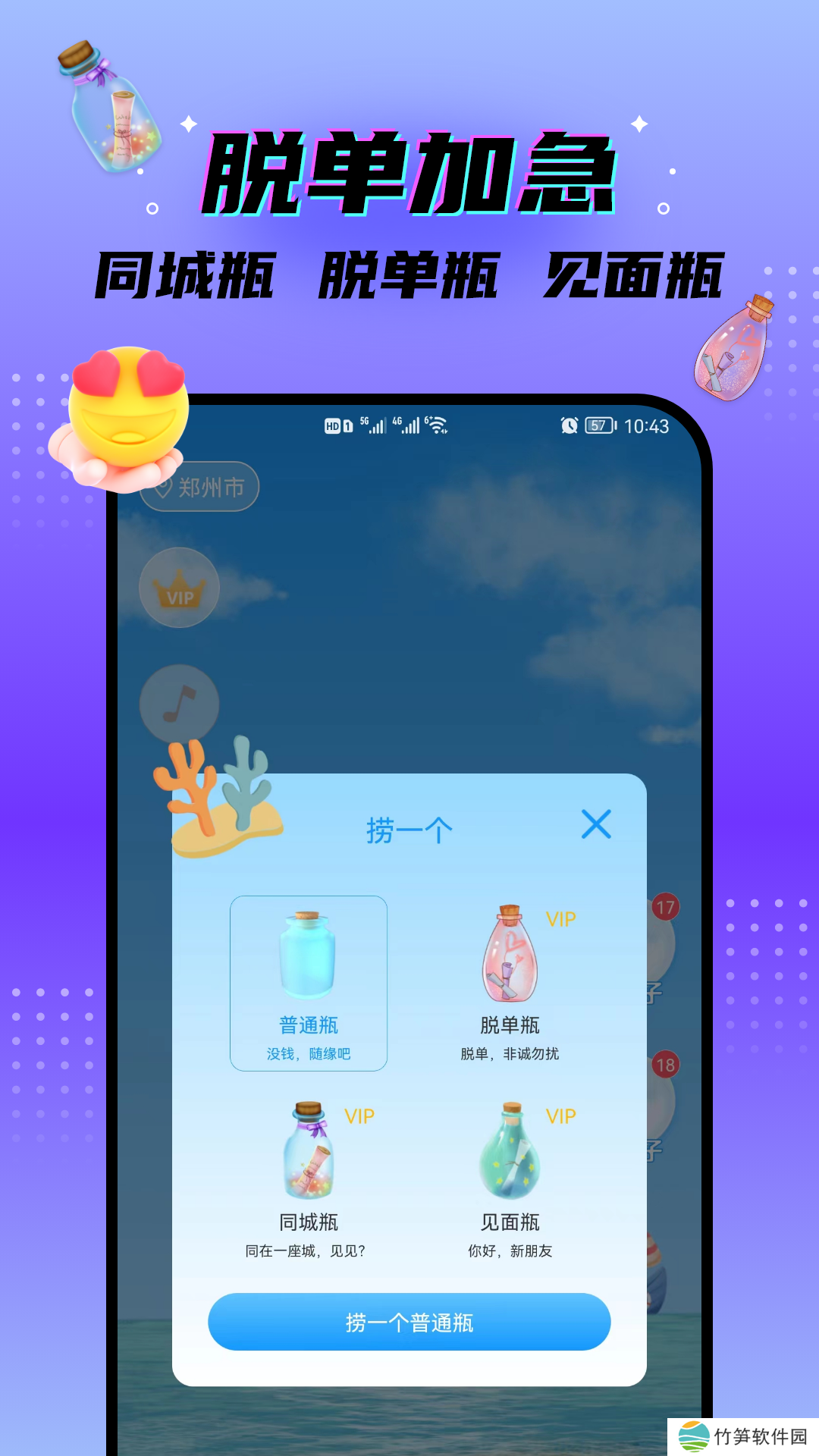 2、丰富的漂流瓶类型:脱单瓶、同城瓶、见面瓶 帮你快速告别单身,快来遇见让你心动的TA