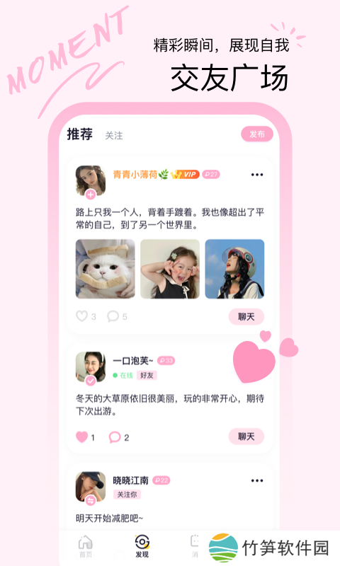 随时随地发布动态,分享生活的喜悦烦恼,和心仪的TA一起秀秀小恩爱,互动交友,俘获她的芳心!也可以默默关注TA的动态,了解TA的喜好,然后给TA不一样的惊喜。