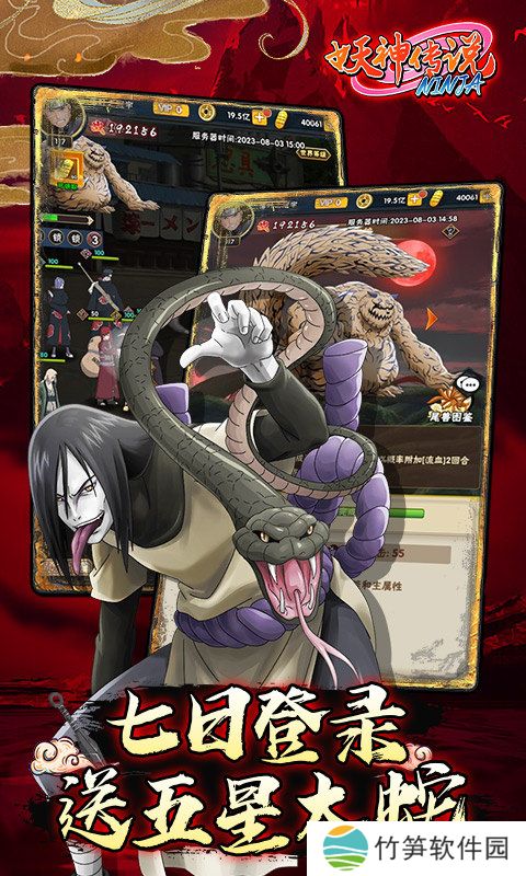 1、登录游戏即可领取五星大蛇丸、1星橙装、高级忍法帖10份、限定忍法帖10份、禁术忍法帖5份以及金币2000枚。