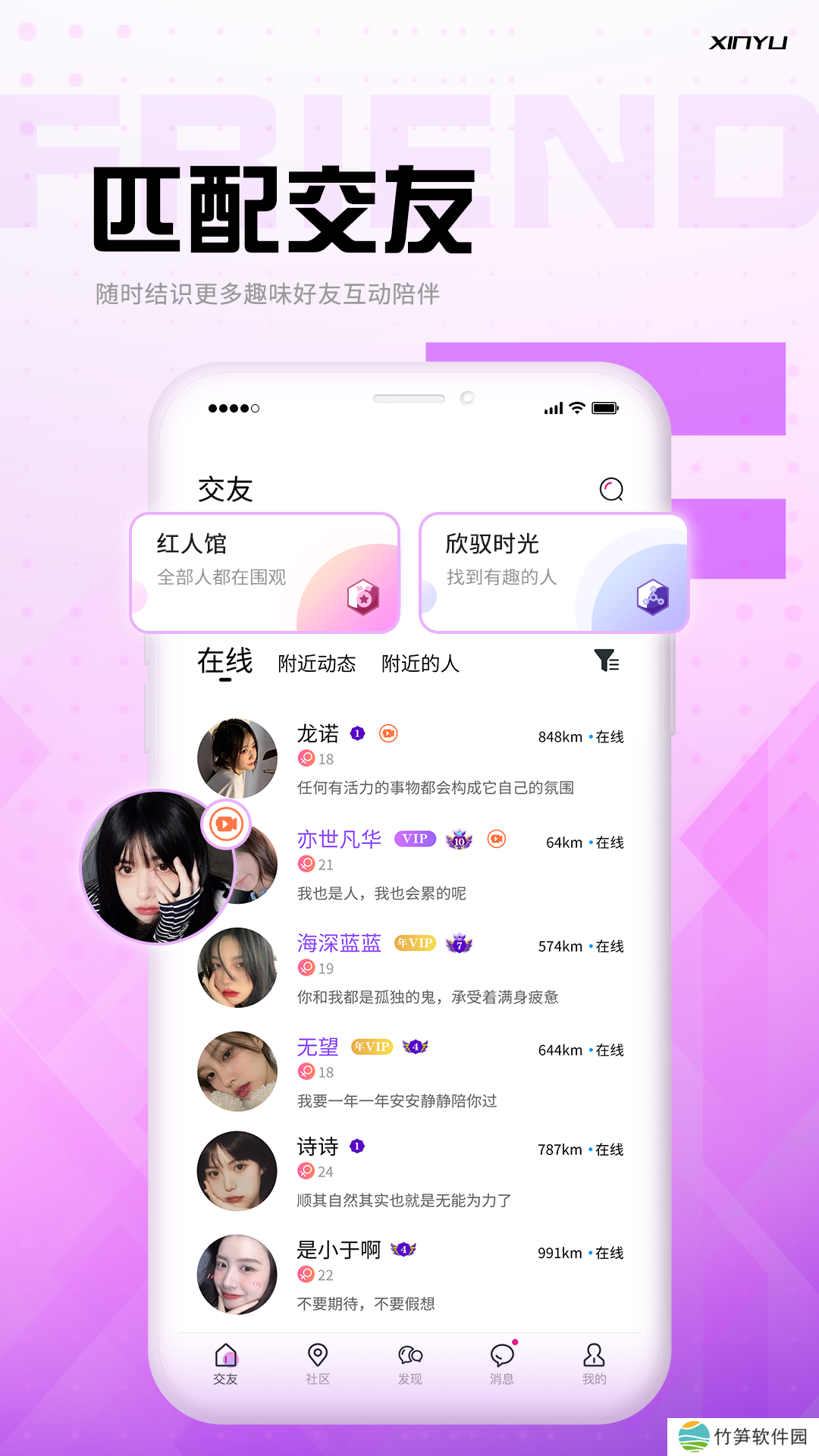 欣驭软件介绍在这里可以体验到更多优质的社交体验,有趣的互动玩法应有尽有,可以根据位置来一键进行智能匹配服务,并且还有附近的好友都可以及时找到,还有自己的动态随时可以分享,好友的动态也可以及时在这里看到。