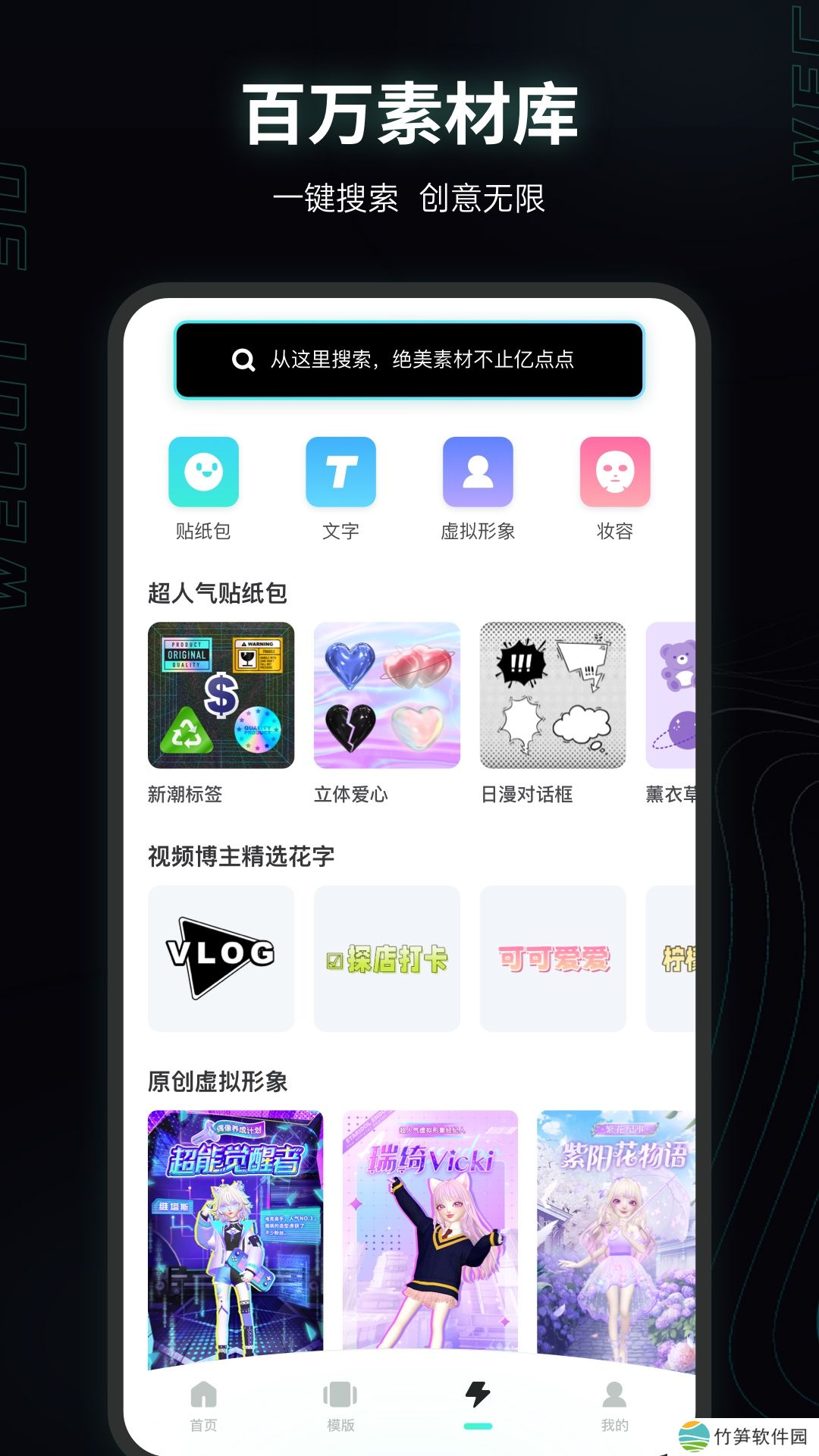 1、海量素材库,服装贴纸文字滤镜等一键搜索。