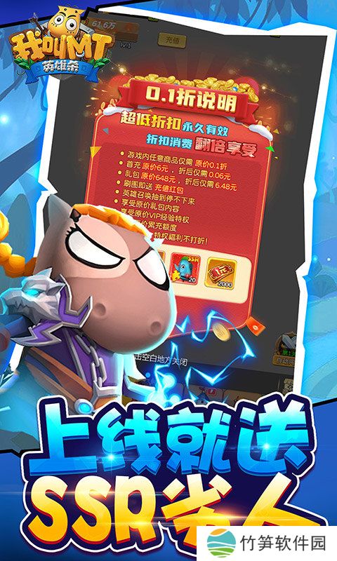 1、登录即赠稀有SSR英雄-劣人、2000元充值卡、限定称号以及众多装备抽奖券。