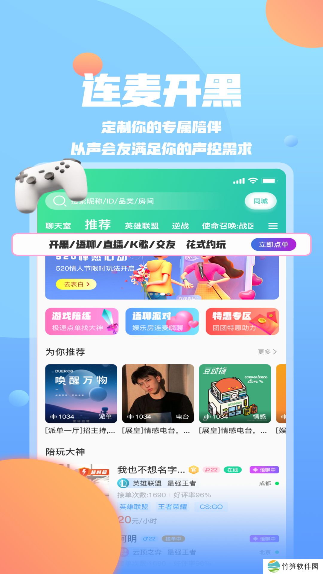 语音交友 终结孤单:真人在线、多人连麦、轻松开玩。在线点单、点歌互动、真人试音、娱乐交友、温馨电台……各路小姐姐小哥哥齐聚聊天室,玩游戏语音交朋友乐趣无穷!