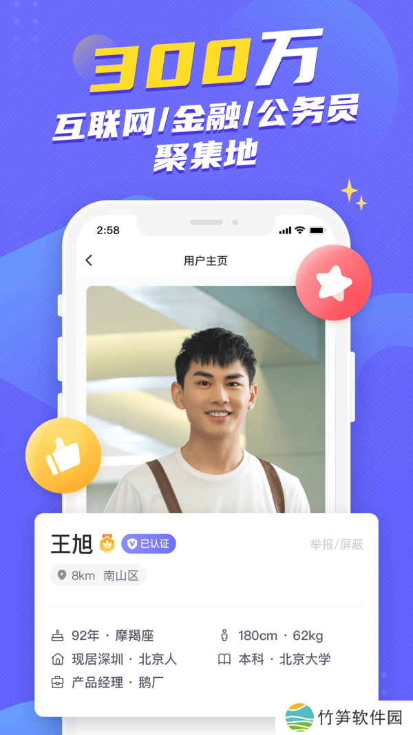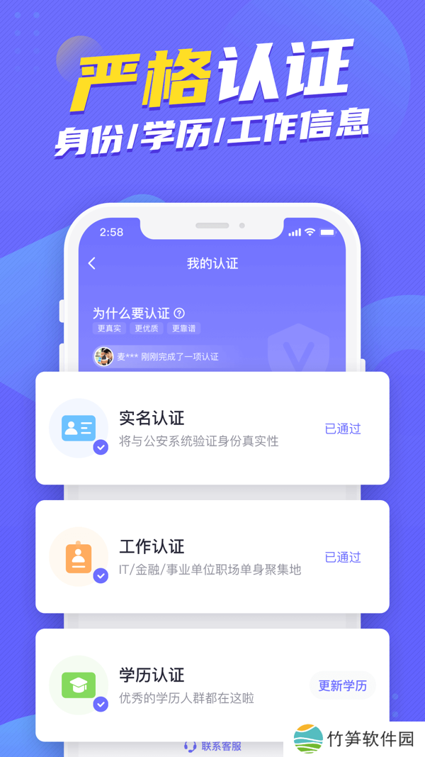 二狗脱单app内容1、实名认证:需完成身份、学历、工作三项认证才可使用,保障真实;
