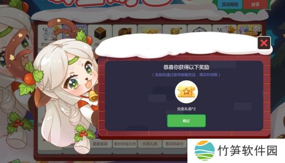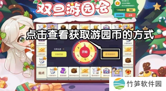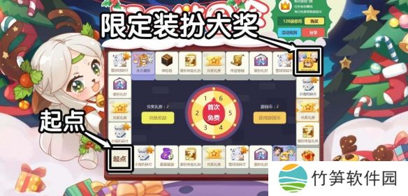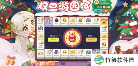 本次双旦游园会是一个“走转盘,赢奖励”的活动,冒险家们通过消耗游园币移动光标,到达对应地点可获得该地点的奖励,右上角设有超级大奖限定皮肤,有机会获得永久宇宙公主装扮!