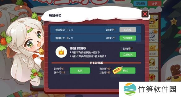 除此之外,相信不少冒险家们已经发现了,本次活动还推出了游园门票特权,消耗账号下的迷你币可以购买游园门票特权,每天可以额外游园币*1,并且每日任务获得的游园币会翻倍!