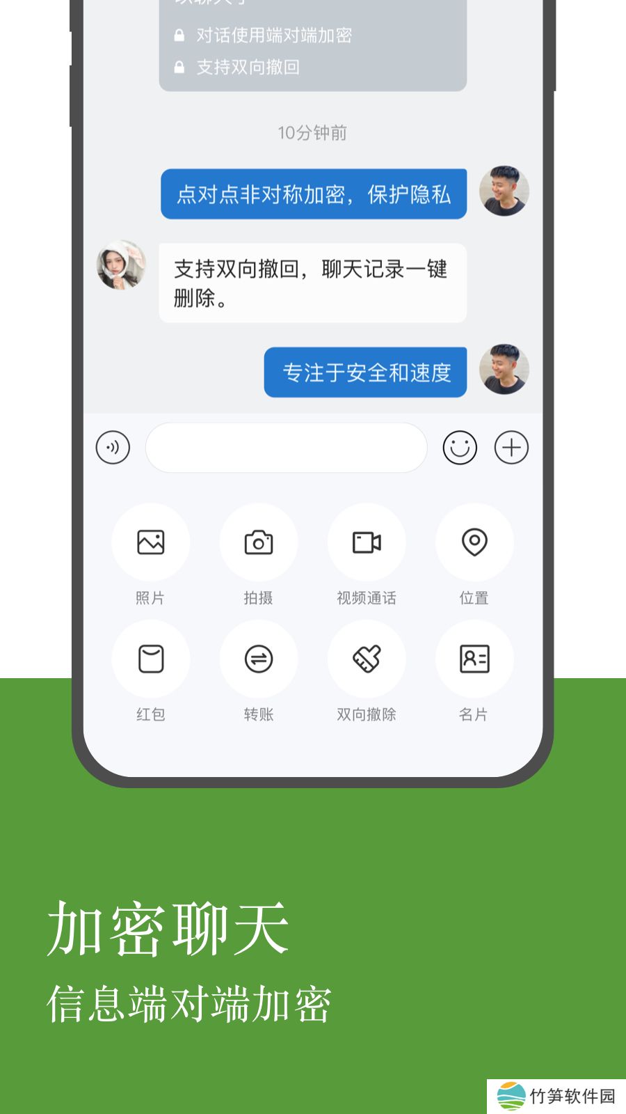 2、消息加密:聊天信息端对端加密,消息通道加密,数据库文件加密,防止被恶意篡改或破解。高质量语音和稳定的视频通话。