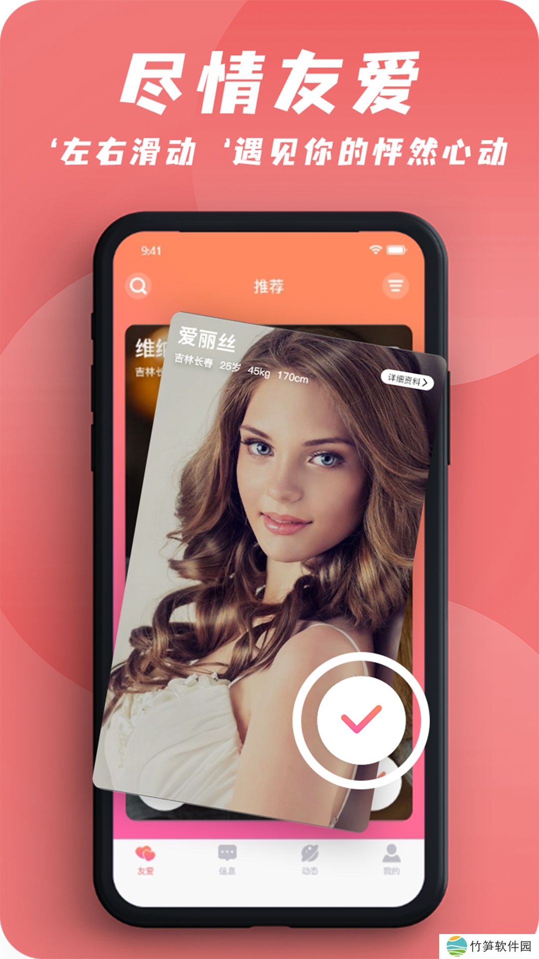 友爱婚恋app是一款开放的手机婚姻和约会应用程序。在友爱,你可以通过视频、文字、声音和图片展示自己,根据地理位置找到附近的人,建立真实、有效、健康的社会关系。友爱秉承“随时随地发现爱情”的宗旨,致力于在中国打造一条长期的发展道路,成为为单身人士提供婚恋交友服务的最佳婚恋服务机构。