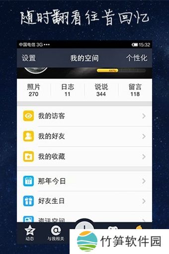 2、我的空间动态:时时显示好友对我的关注与回复,第一时间进行互动与分享。