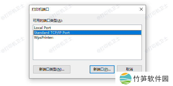 4、选择适用的端口类型(如标准TCP/IP端口或USB端口)并点击“新端口”。
