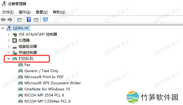 2、展开“打印队列”或“通用串行总线控制器”,查找是否有灰色图标的打印设备。