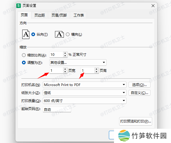 将“调整为”选项中选择“其他设置”,将页宽和页高都设置为“1 页”,即“1 页宽 × 1 页高”;