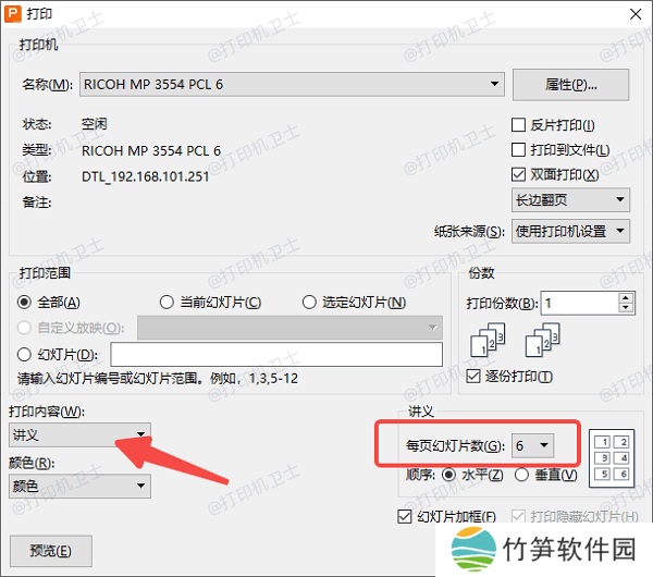 2、在“打印内容”下方选择“讲义”,并设定“每页幻灯片数”为6张。