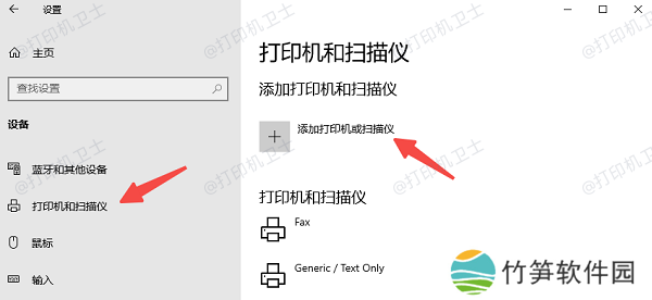2、在左侧点击“打印机和扫描仪”,然后点击右侧“添加打印机或扫描仪”。