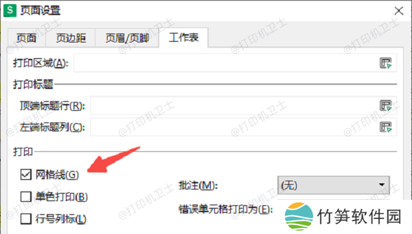 2、在“页面设置”区域中找到“网格线”,勾选“打印”前的复选框。