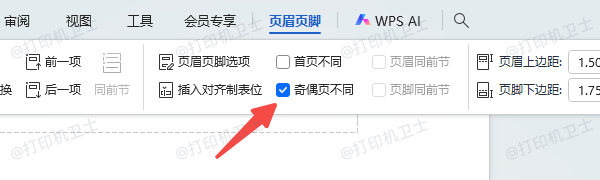 2、在顶部“设计”选项卡中勾选“不同奇偶页”。
